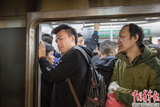 11月13日早,海淀黄庄站,王彬(左)挤入早高峰的地铁车厢,到达实习单位需要坐50分钟。实习前,他从未如此频繁地乘坐过北京地铁。在积累工作经验之外,在平台好的大公司获得一份比较光鲜的实习经历,对求职、留学都有帮助,这已经成为许多大学生的共识。