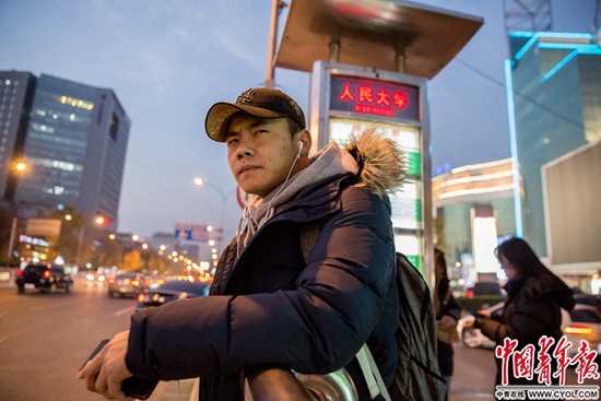 11月12日傍晚,人民大学公交站台,外出采访的嘎玛次仁在等车。上大学前从未离开过西藏、来北京后才第一次吃快餐的嘎玛,现在已经熟悉了这座大城市。他在单位做播音员、摄影师、藏语翻译、网站编辑,最近在采写一篇关于西藏人在北京的特稿。