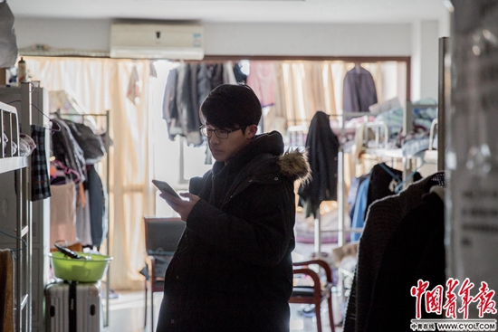 11月16日,刘朔准备离开出租屋去上班。没有固定的实习工资,他只能栖居在单位附近月租800元的群租房里。房子地处南二环内,150余平方米的空间里住着近20个年轻人。在这里生活了两个月,刘朔和这里的大部分租客一样相互间仍然陌生。