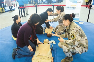 日前,2018中国国际教育巡回展(北京)上,专业人员现场讲解,互动演练、生活中突发事件安全应急方法,观众在现场学习心肺复苏。(春光/人民图片)