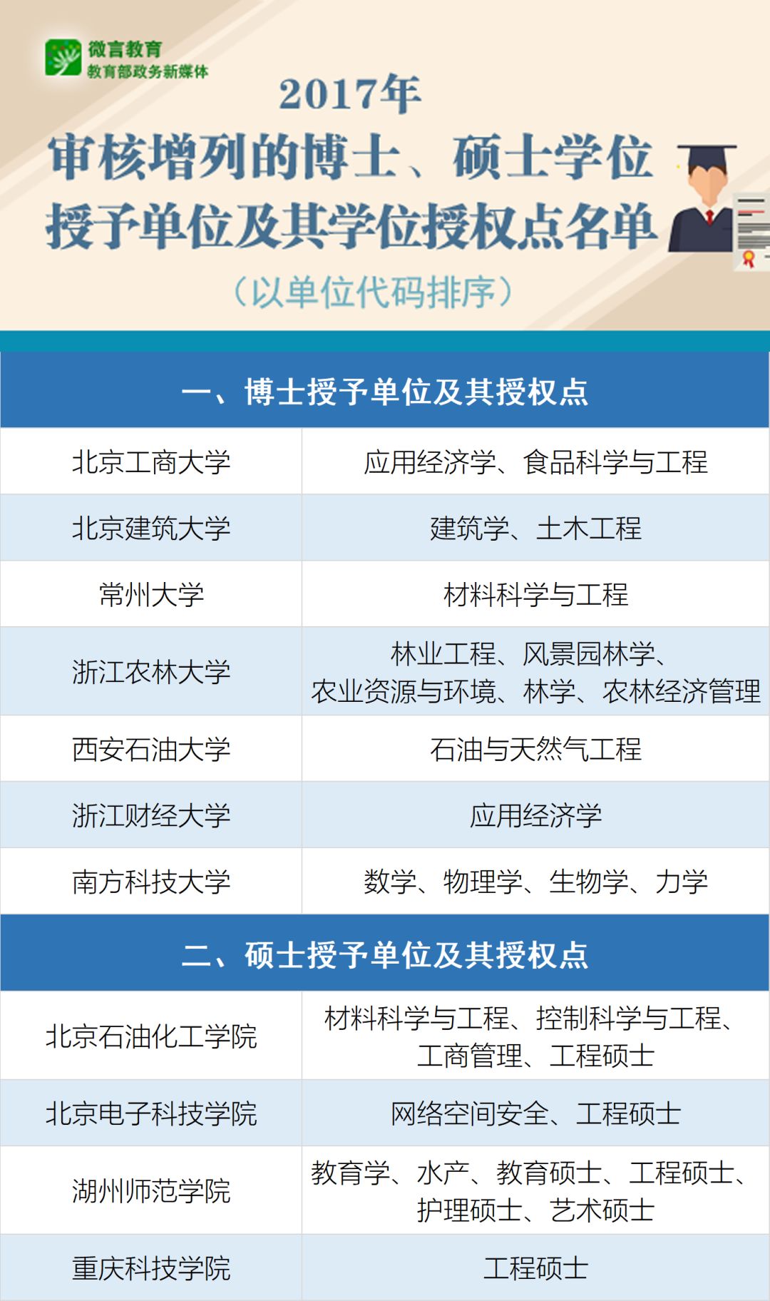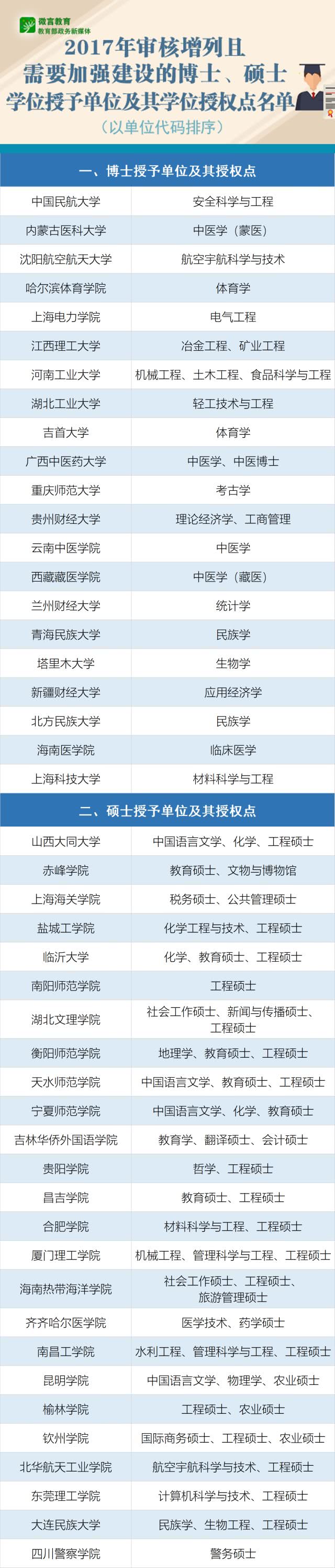 2017年新增博士、硕士学位授予单位及其授权点名单公布