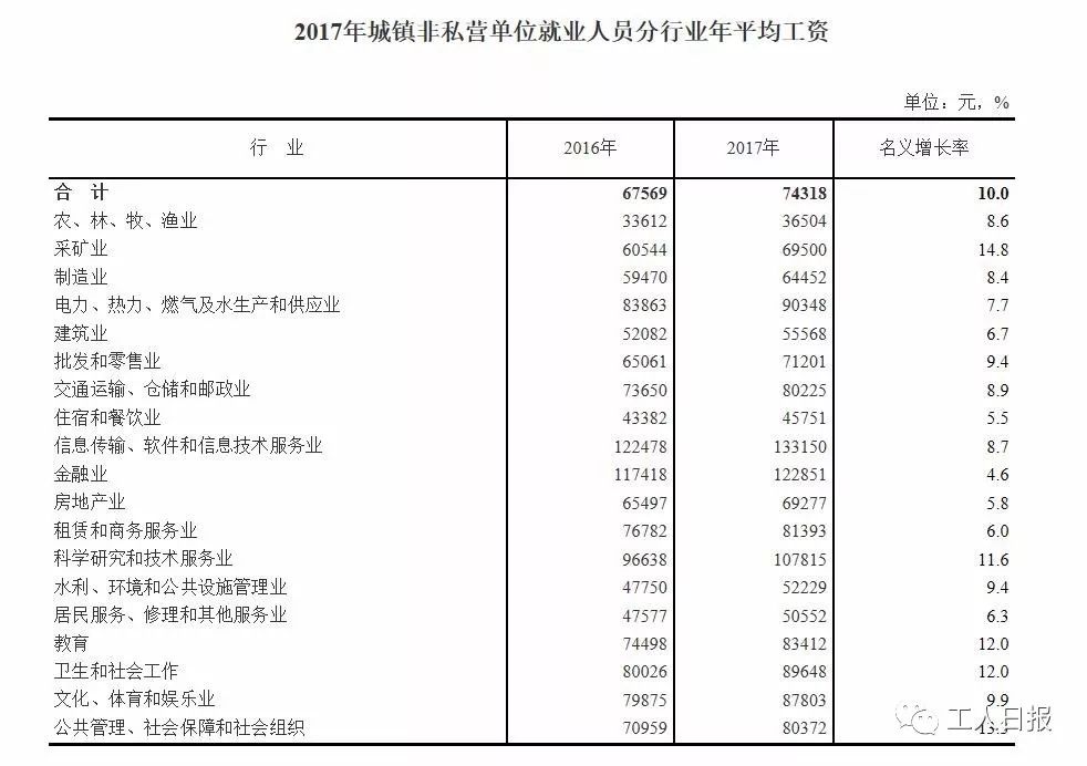 2017年,全国城镇非私营单位就业人员年平均工资为74318元,比上年增长10.0%,增速比上年加快1.1个百分点,扣除物价因素,实际增长8.2%;