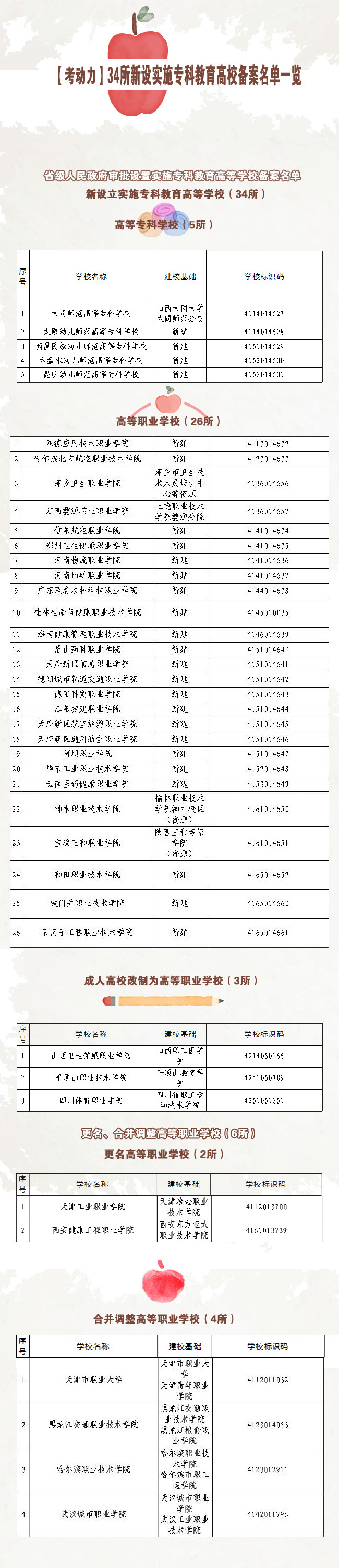 新华网北京5月29日电 近日,教育部办公厅印发《关于公布实施专科教育高等学校备案名单的函》,公布了省级人民政府审批设置实施专科教育高等学校备案名单。其中包含:新设立实施专科教育高等学校34所,更名、合并调整高等职业学校6所。跟随小编一起来了解下吧!