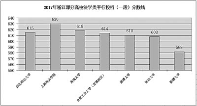 如果说这一事例还不典型的话,我们可以看另外一组数据(见2017浙江部分高校法学类平行投档分数线图)。