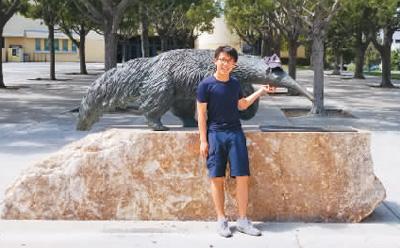 图为朱胤恒在加州大学欧文分校门口留影,其身后是学校的吉祥物。