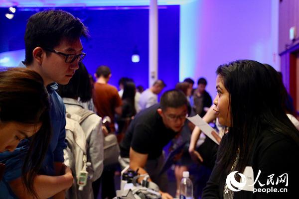 在领英海外人才招聘活动上,一名求职者(左)与企业代表进行交流。人民网张洁娴摄