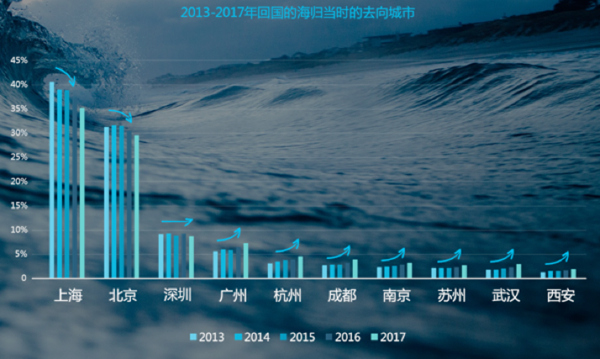 与此同时,“新一线城市”对海外人才的吸引力也呈现上升趋势。报告显示,尽管近年来海归回国后选择的主要城市排名没有变化,但北京和上海所占百分比明显下降,而以杭州和成都为代表的“新一线城市”的吸引力逐年上升。