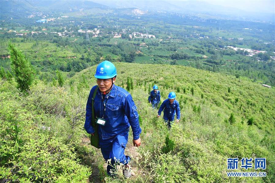 7月24日,在河南省新密市牛店镇花家店村,张长栓(前)走在巡线路上。新华社记者 冯大鹏 摄