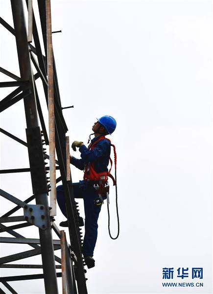 盛夏时节,用电负荷攀升,各地巡线工人坚守在工作一线,保障用电安全。 “90后”吴俊鹏是国家电网郑州供电公司输电运检室一名普通巡线工,他和师傅——有着33年工作经验的老“蜘蛛侠”张长栓一起,每日冒着酷暑攀爬高压输电铁塔巡视检查。吴俊鹏说:“虽然辛苦,但通过努力保障社会正常用电,我感觉特别值得。”