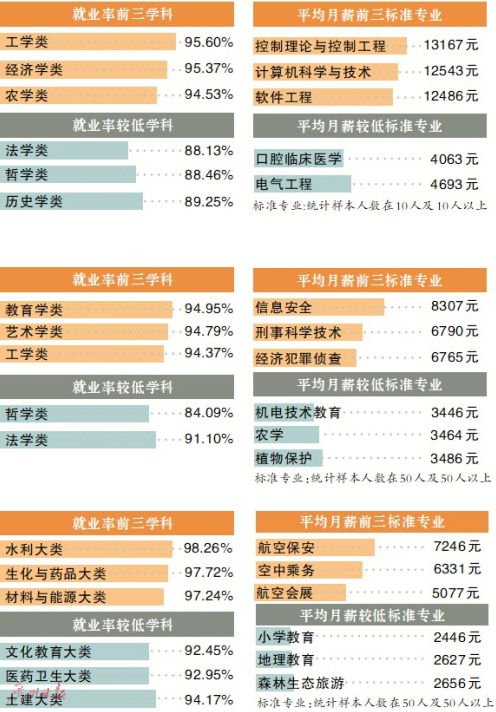 本科的平均月薪为4522元。 其中,哲学类最高,为5578元;其次是教育学类,为4939元;第三是工学类,为4842元。相对较低的为农学类(4107元)、医学类(4258元)和管理学类(4311元)。在统计样本人数最多的前20个专业中,月薪最高的是软件工程,为6259元,其次是计算机科学与技术,为5219元;最低的是会计学,为3982元,其次是物流管理,为4115元。就业人数较多的专业中,比全省本科生平均薪酬(4522元)高的还有汉语言文学(4554元)、金融学(4629元)等专业。