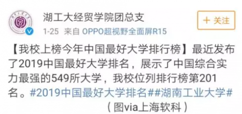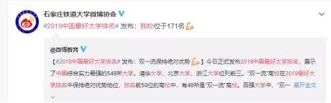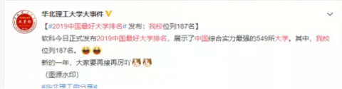 然而,也有一些学校对“2019中国最好大学排行榜”持欢迎态度。一些学校的官方媒体还公布了自己的排名。中国青年报·中青在线记者搜索到了一些高校官方微博发布的消息。