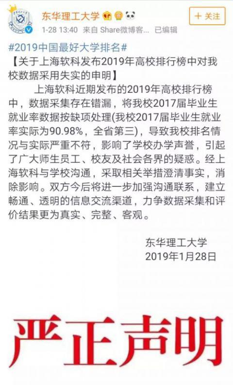 1月28日,东华理工大学在其官方微博发表声明,称上海软科发布的“2019中国最好大学排行榜”中关于该校的数据采用严重失实,损害了该校的办学声誉。该校还表示,上海软科已经和学校进行了沟通,采取相关举措澄清事实并消除影响。