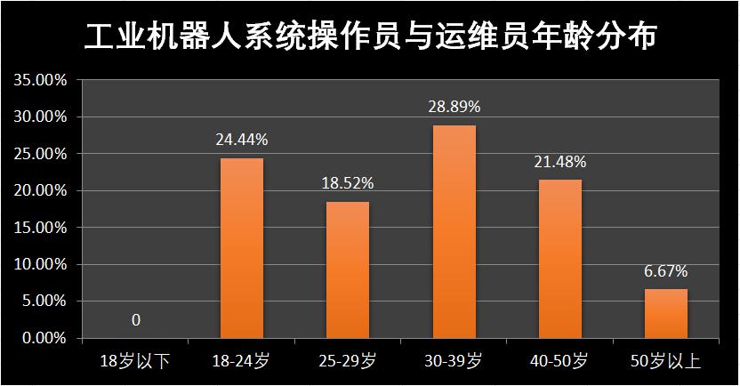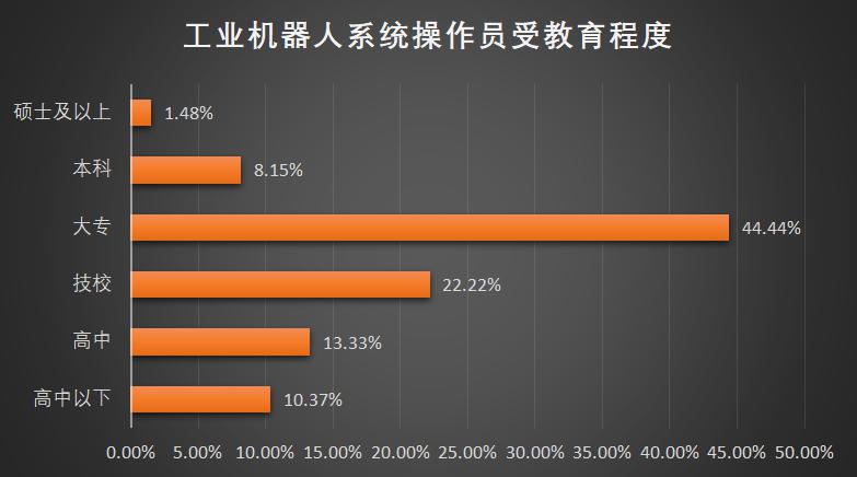 3、【学历分布】44.44%的工业机器人系统操作员是专科学历,1.48%为硕士研究生,45%的学历为大专及以下。工业机器人系统操作员就业门槛低。